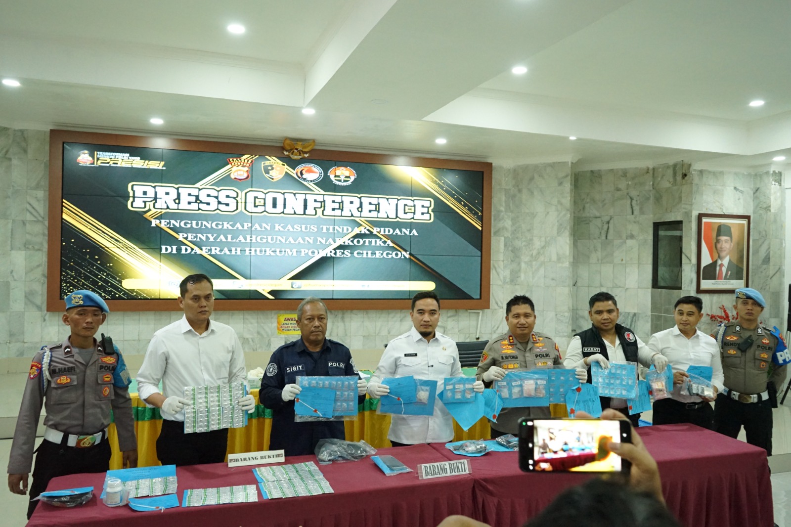 Kegiatan press release tersebut dipimpin langsung oleh Kapolres Cilegon AKBP Dr. Martua Raja Taripar Laut Silitonga, S.H., S.I.K., M.Si. Turut hadir dalam kegiatan tersebut Wali Kota Cilegon H. Robinsar, Kasat Narkoba Polres Cilegon AKP AKP Suryanto, S.E, serta Kasi Humas Polres Cilegon AKP Sigit Dermawan, bersama para pejabat utama dan undangan lainnya.